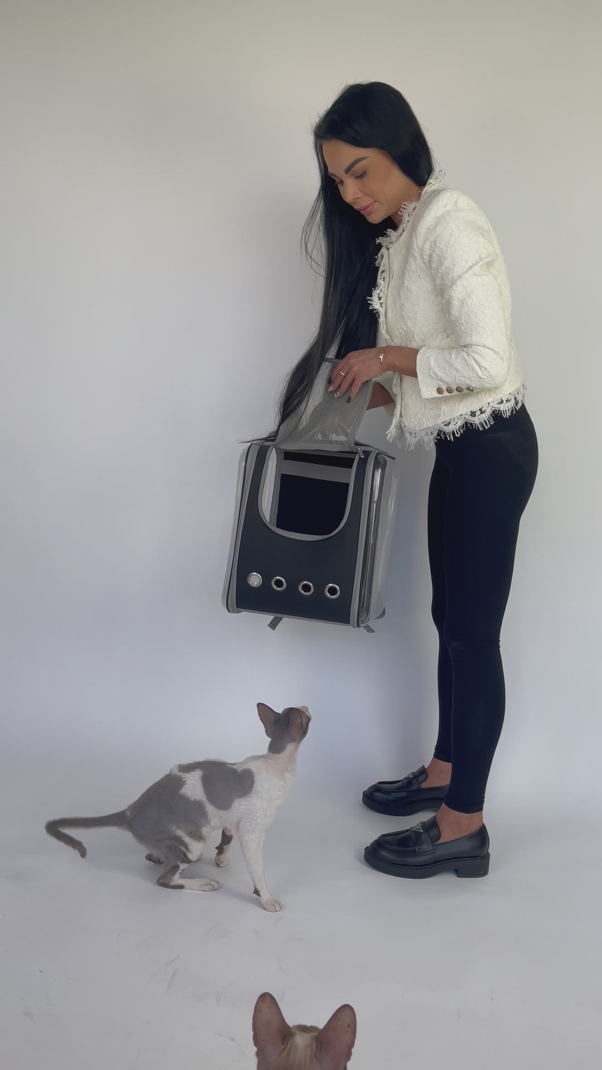 Klasická přepravka není na delší vycházky příliš vhodná, ale náš batůžek je na tyto příležitosti naprosto ideální. Uvnitř přepravky se nachází i karabinka na připnutí vodítka. Na horní částí přepravky se nachází několik průduchů, díky kterým dochází k neustálé cirkulaci vzduchu. Průhledné boky poskytují kočičce výhled a přehled nad situací. Přepravka je z velmi pevného, kvalitního materiálu, zbytečně se nehoupe a kočičku nestresuje.