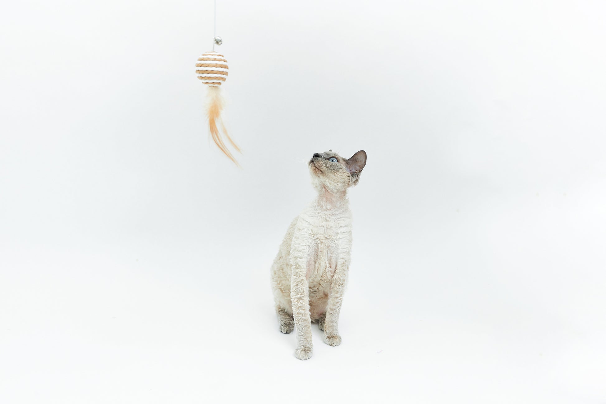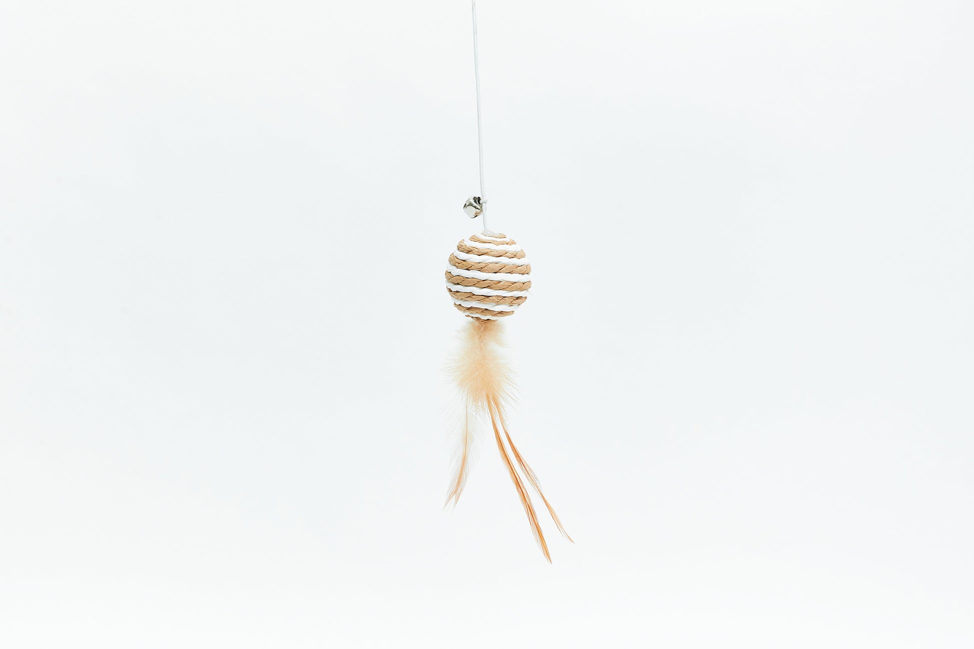 Proutěná kulička s peříčky a rolničkou na dřevěném proutku, která upoutá pozornost každé kočičky.