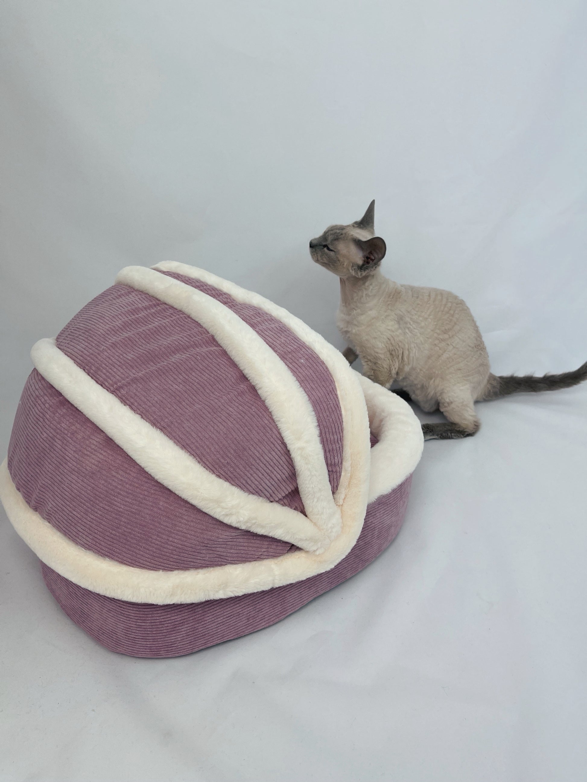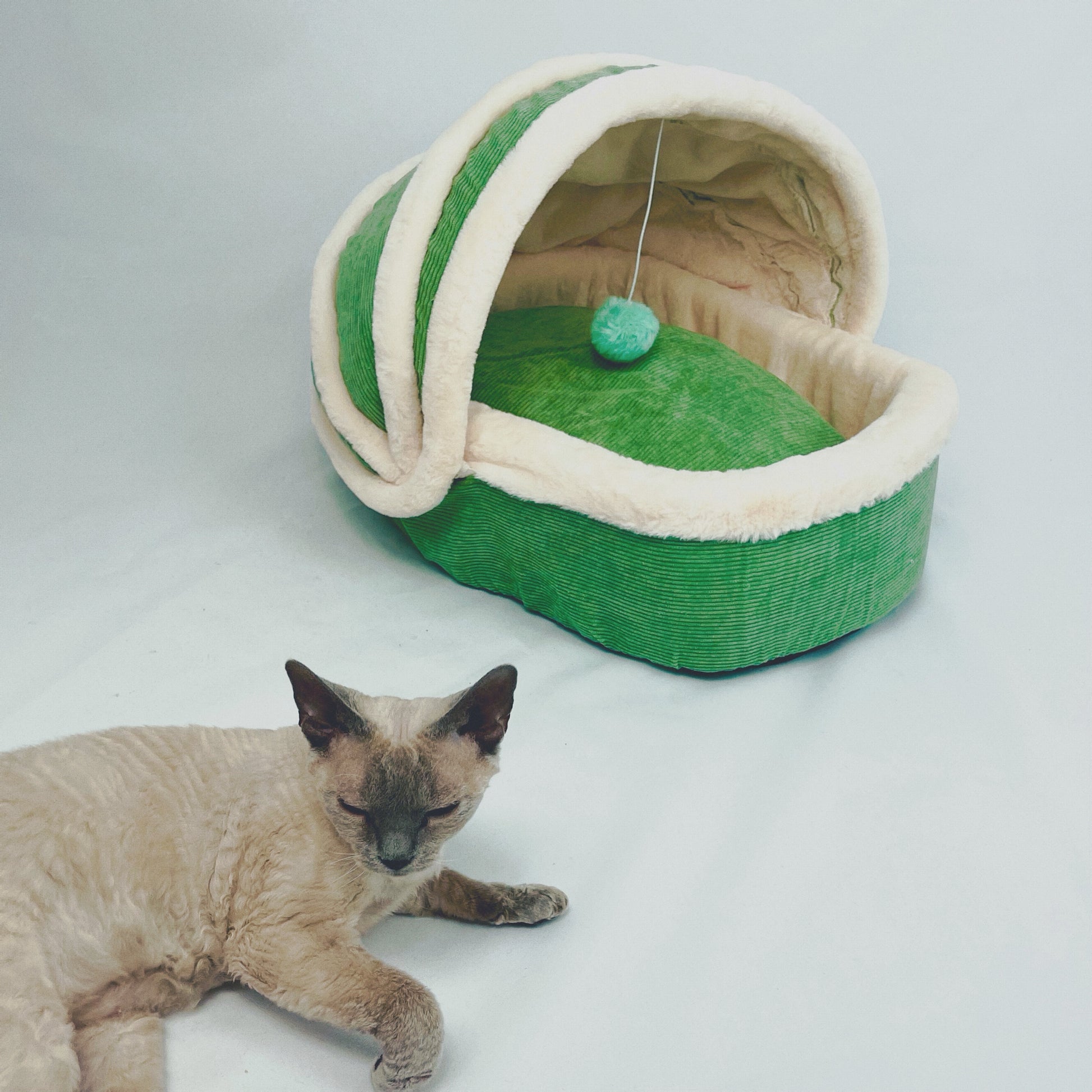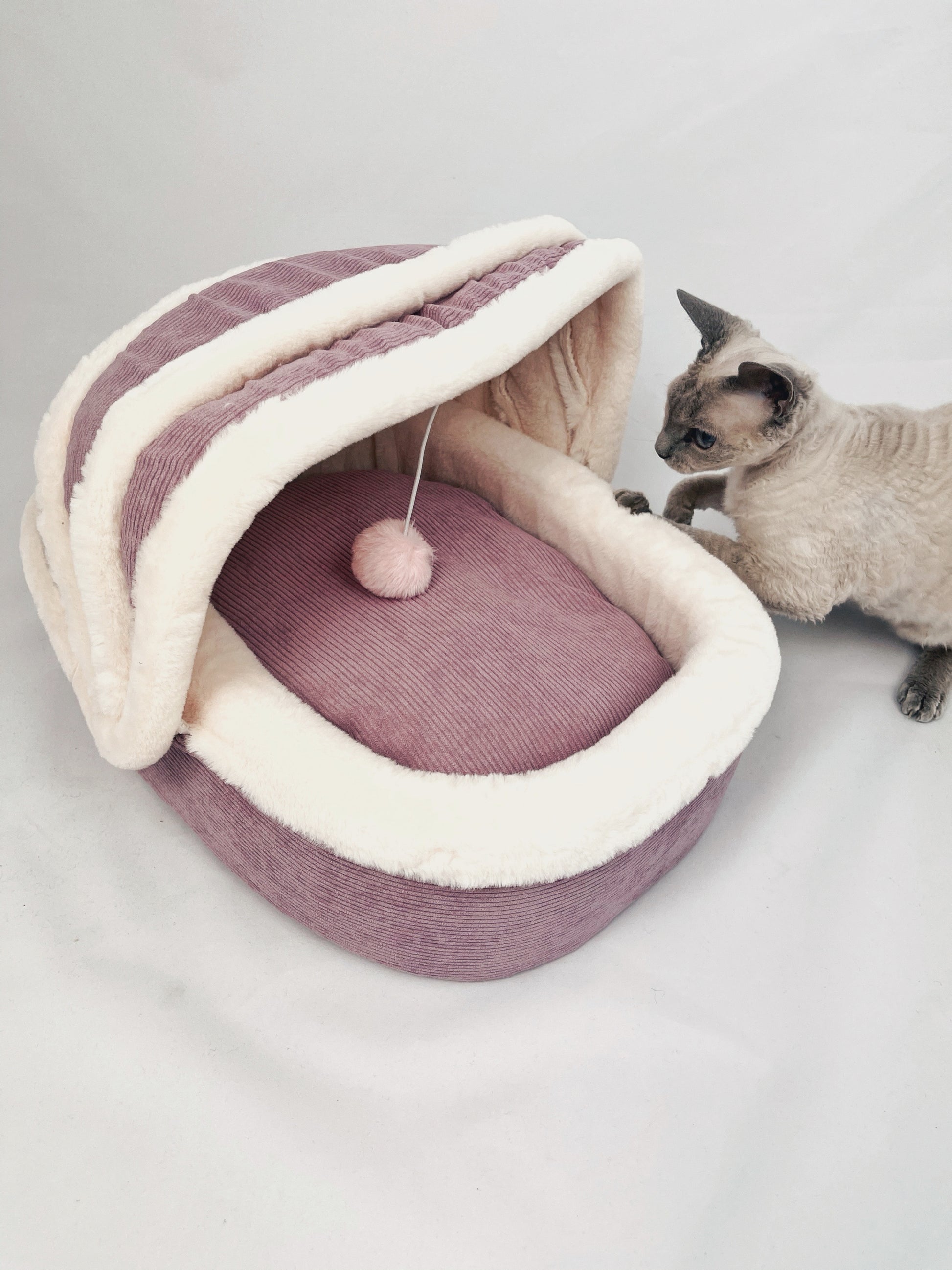 Pohodlný pelíšek z kvalitního materiálu, může být jak oblíbenou kočičí postýlkou, tak hračkou. Heboučký plyš se kočičkám, které pelíšek testovaly zamlouval nejvíce ze všech použitých materiálů. Polštářek na ležení je oboustranný plyš/látka a lze jej prát v pračce. Růžový pelíšek je menší velikosti 49x42x33 cm. Zelený pelíšek je větší velikosti 54x47x40 cm.