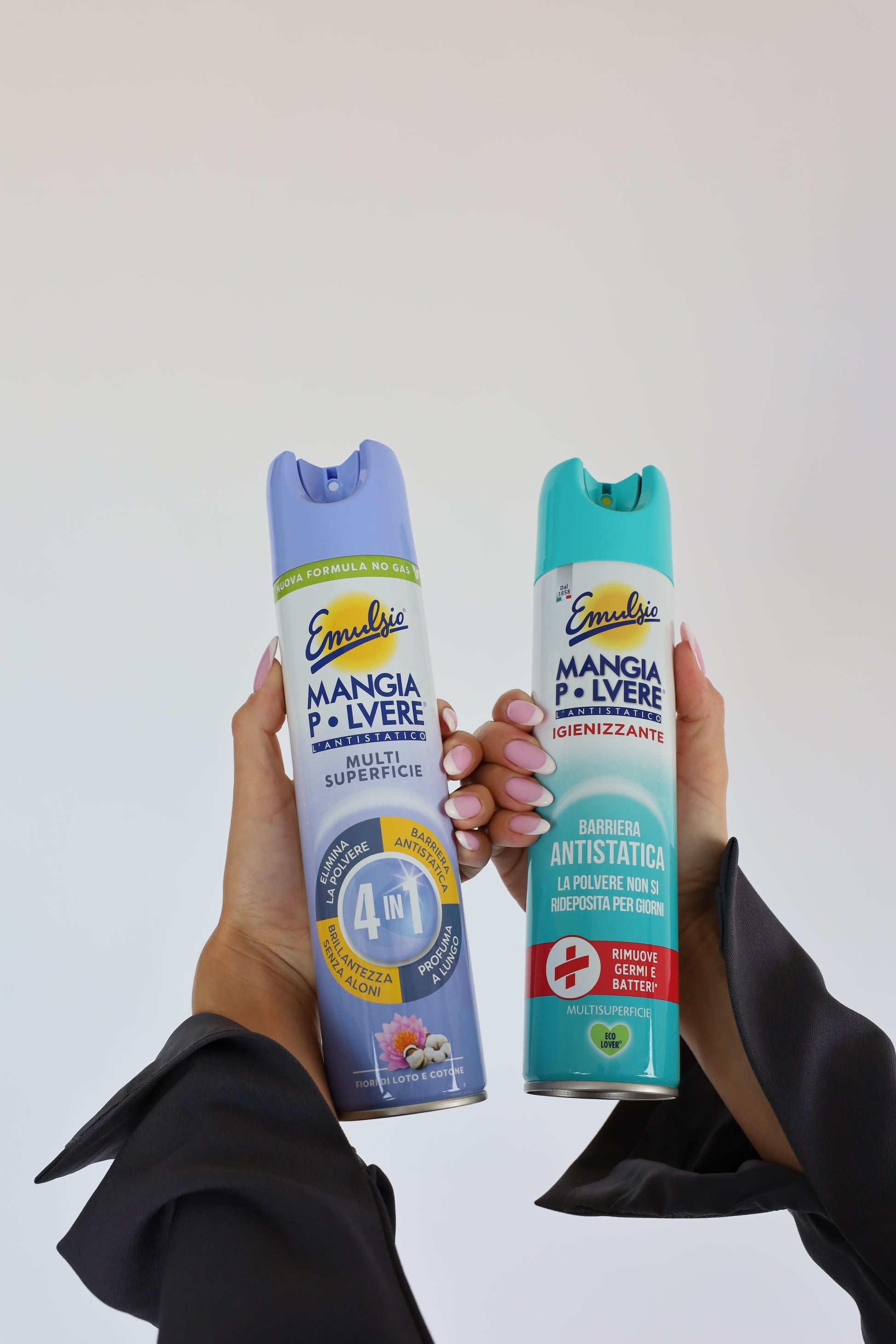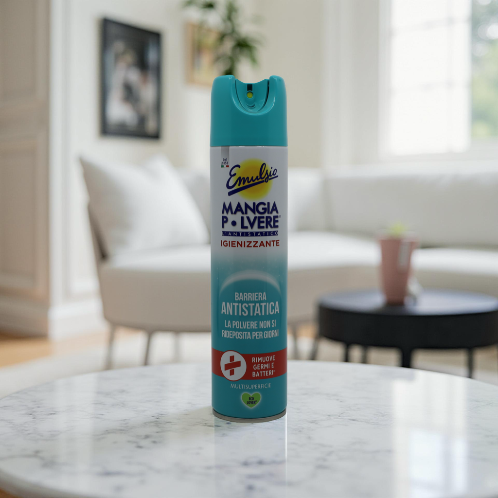Emulsio Mangia Polvere Igienizzante Hi-Tech je chytrý antistatický sprej pro obrazovky, monitory, tablety, telefony, klávesnice i ovladače. Prach a otisky sundá bez zbytečného víření do vzduchu, na povrchu vytvoří neviditelnou antistatickou bariéru, která zpomalí opětovné usazování prachu, a zanechá čistý, jemně parfémovaný dojem pivoňky a květů třešní. Receptura „no-gas“ s technologií stlačeného vzduchu a 100% recyklovatelný obal zapadnou do každodenního provozu domácností se zvířaty – účinně, ohleduplně a s lehkou, nepřetěžující vůní.