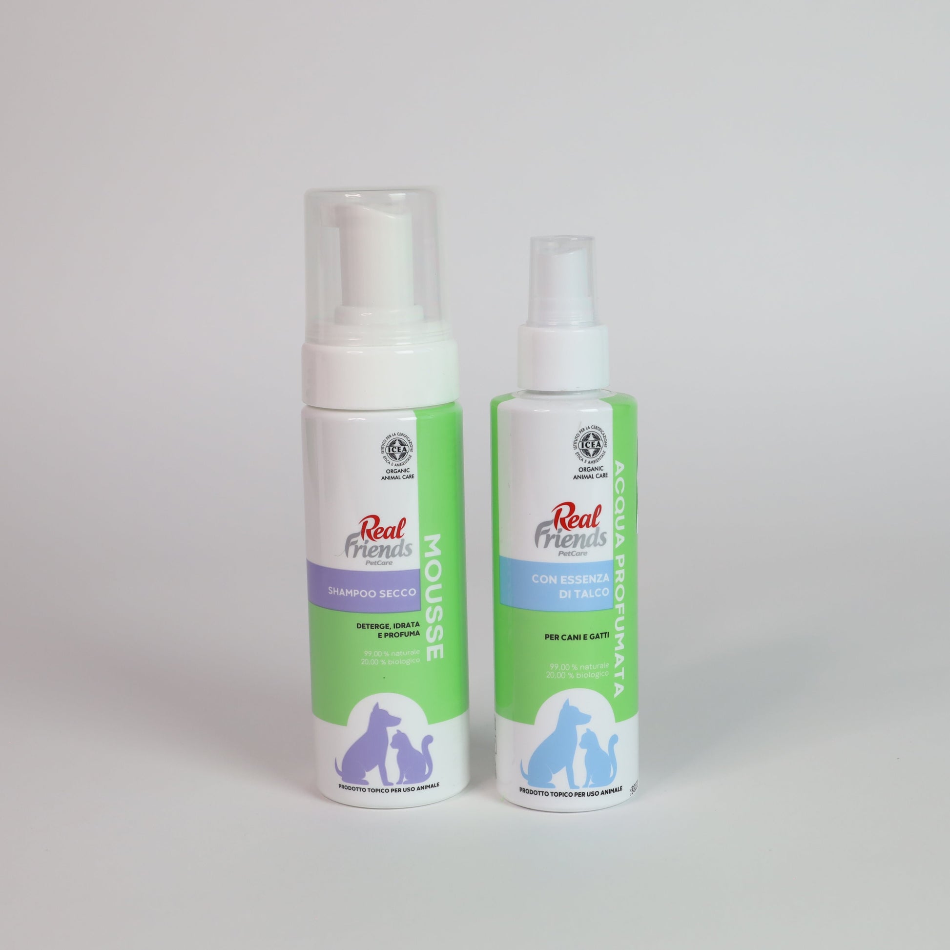 Žádný problém! Stačí sáhnout po tomto balíčku, ve kterém najdete suchý šampon a parfém s jemnou pudrovou vůní, která potěší vaše smysly, ale nebude mazlíčkovi vadit.